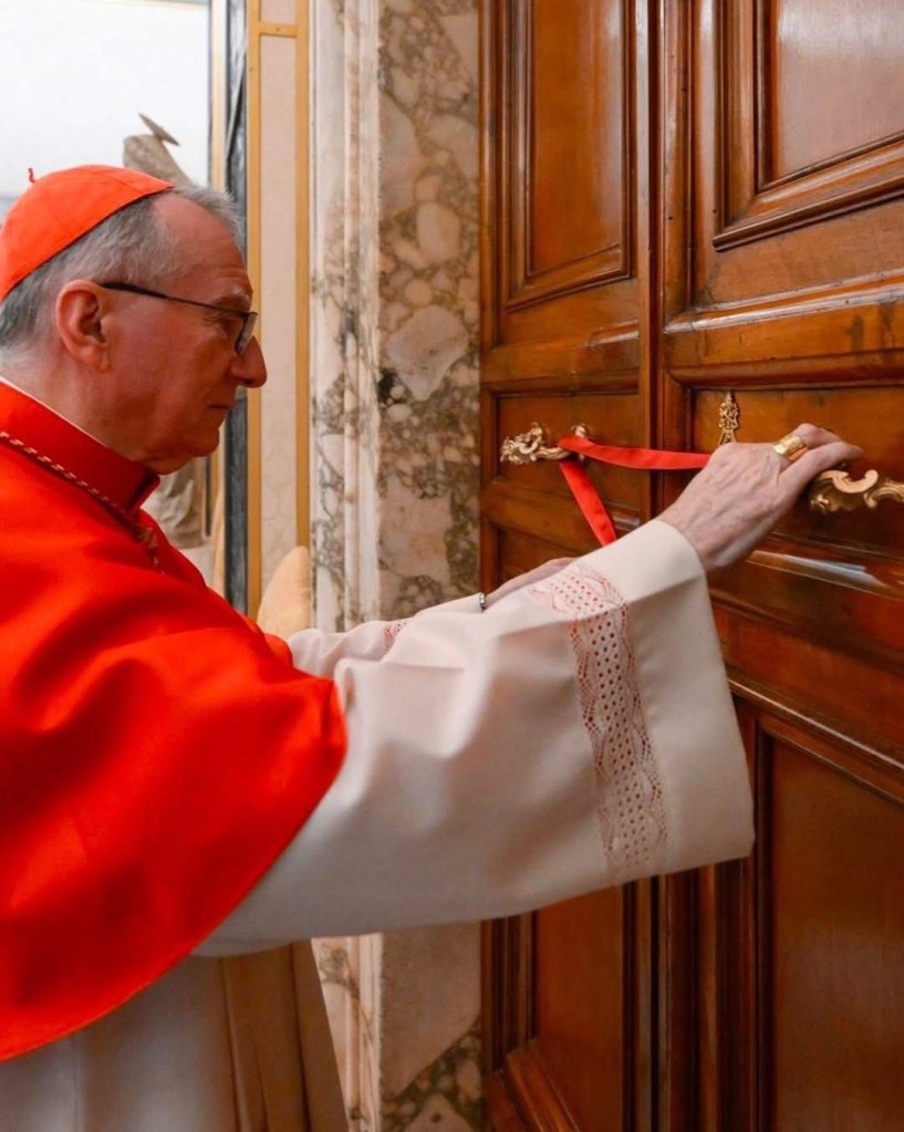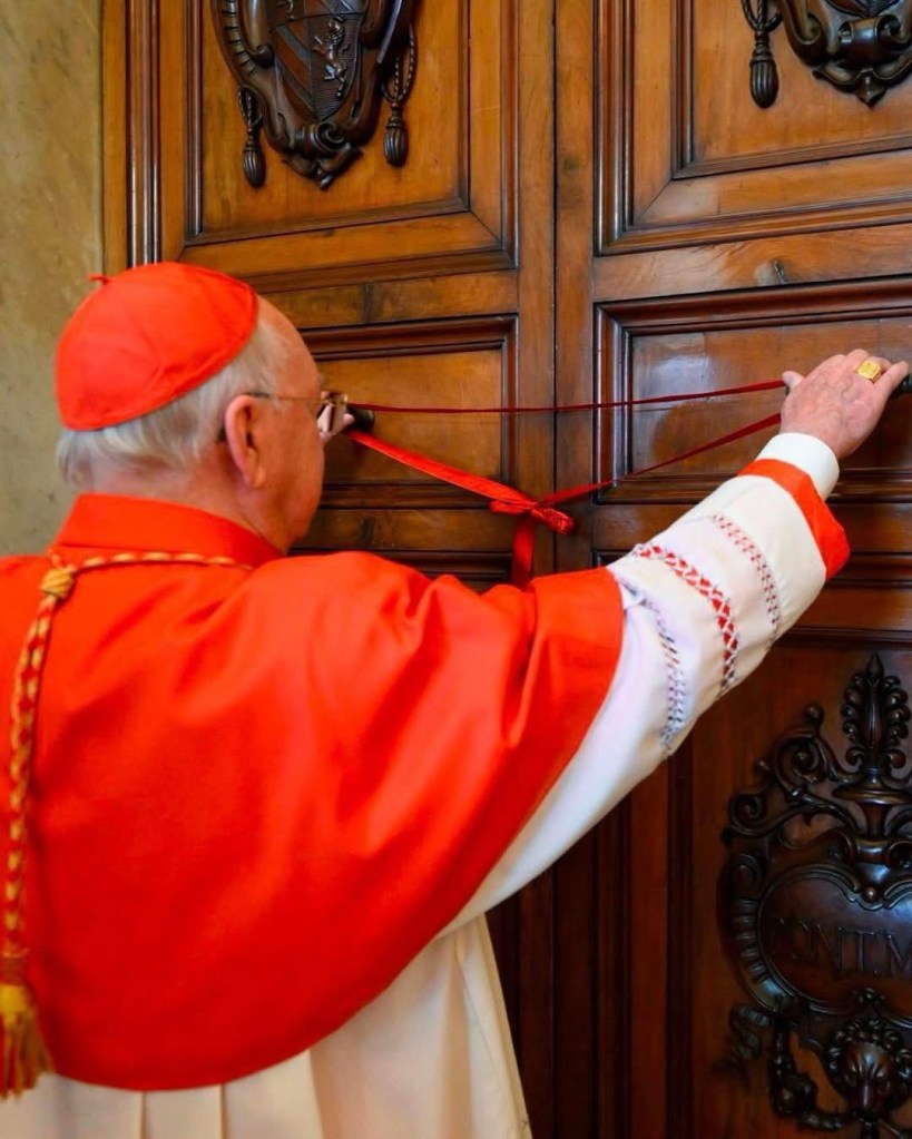 Therefore, in order to avoid fraud and manipulation of papal documents of the previous Pope, and to prevent release of items that can only be done by the new Pope, the Pope’s Apartment is sealed, by a special officer of the Roman Curia, that is the Camerlengo (Chamberlain) of the Holy Roman Church, who is now Cardinal Kevin Farrell, who is also the Prefect of the Dicastery for the Laity, Family and Life.